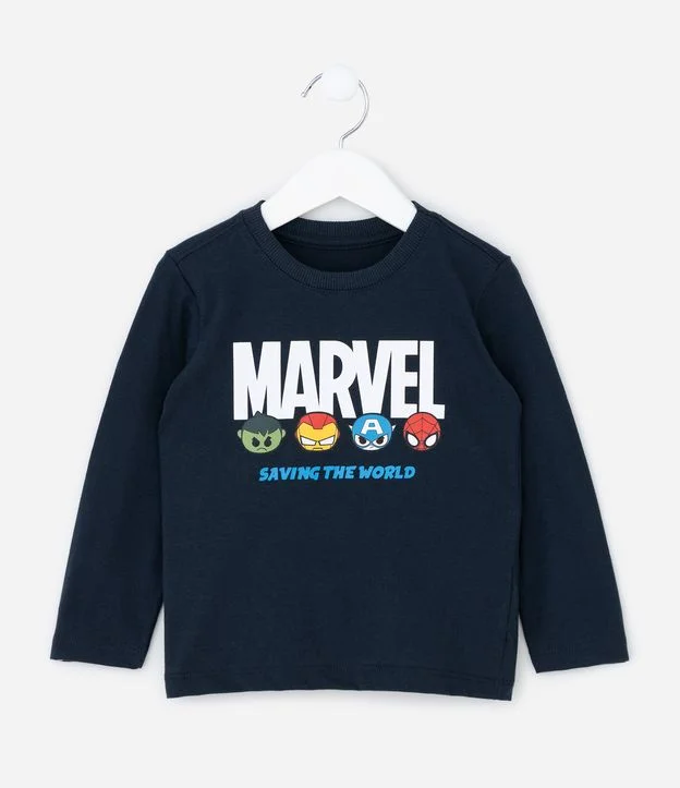 Camiseta infantil confeccionada em algodão certificado BCI e boas práticas ambientais. Modelo com gola redonda, mangas longas e barra tradicional. Possui estampa localizada com lettering Marvel e carinhas dos heróis Avengers em versão baby, garantindo visual divertido para fãs do universo dos super-heróis.