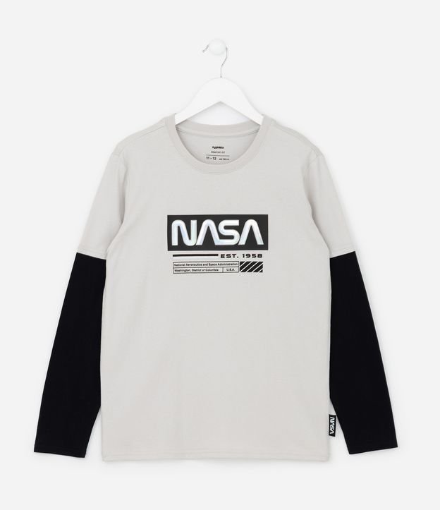 Camiseta infantil confeccionada em algodão mais sustentável. Possui gola redonda, mangas longas contrastantes e estampa holográfica em relevo da NASA.
