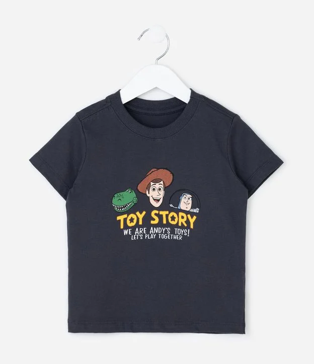 Camiseta infantil confeccionada em meia malha de algodão com toque macio e confortável. Possui gola redonda, mangas curtas e estampa localizada com personagens de Toy Story, animação que apresenta Woody, Buzz e seus amigos em aventuras que celebram amizade, união e imaginação ao longo de gerações.