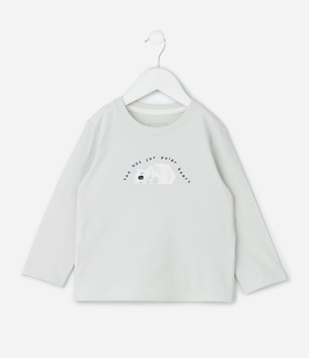 Camiseta infantil confeccionada em algodão certificado BCI. Possui gola redonda, mangas longas e estampa localizada de urso polar aplicada na frente e nas costas.