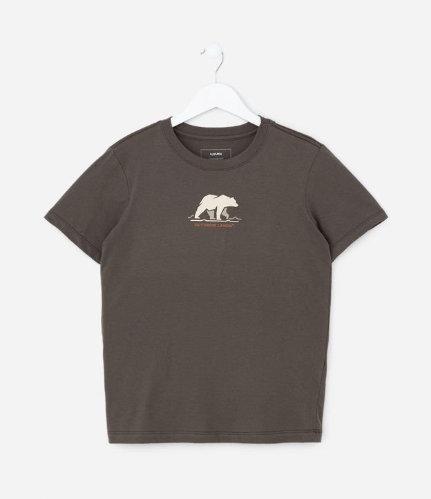 Camiseta infantil com gola redonda, manga curta e estampa de urso com lettering "Outdside lands". O item é confeccionado com boas práticas ambientais e algodão certificado bci.