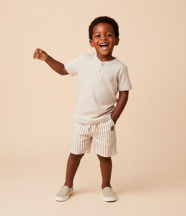 Camiseta Infantil com Gola Henley Texturizada - Tam 1 a 6 Anos Bege