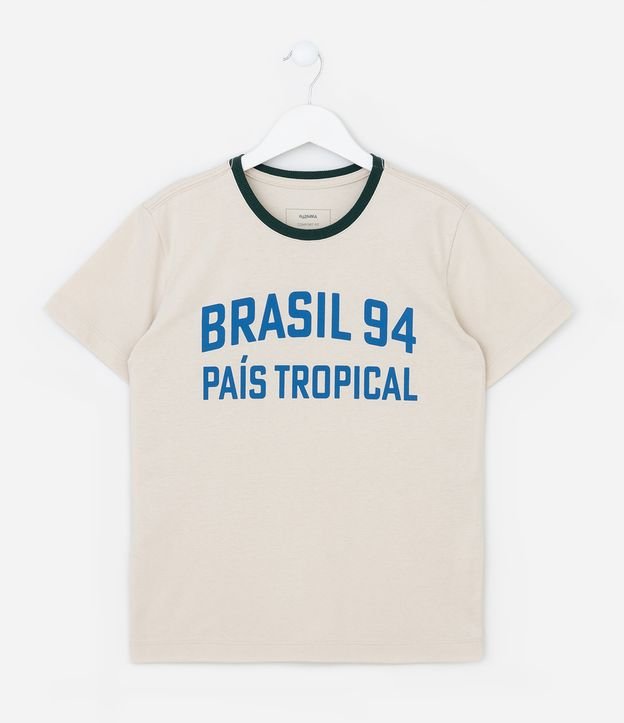 Camiseta infantil confeccionada em cotton mais sustentável através de boas práticas ambientais, no modelo regular. Possui gola redonda contrastante, manga curta e estampa lettering "Brasil 94 País Tropical".