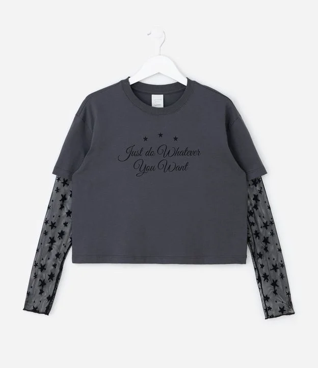 Camiseta Infantil com Lettering e Manga Renda – Tam 5 a 14 Anos Cinza Escuro