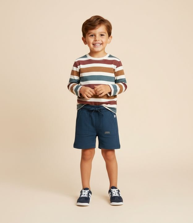 Camiseta infantil confeccionada em algodão certificado BCI, proporcionando toque macio e conforto para o dia a dia. Possui gola redonda, mangas longas e estampa full print de listras, criando visual divertido e moderno para compor combinações casuais.