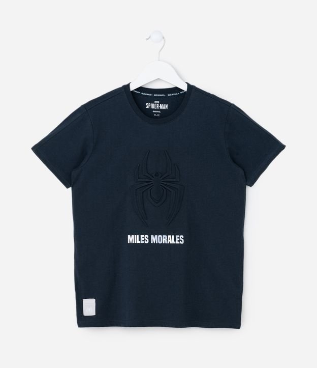 Camiseta infantil com gola redonda, mangas curtas e estampa de aranha em relevo com lettering "Miles Morales" do Homem-Aranha. A peça é confeccionada com algodão certificado bci.