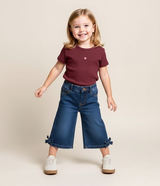 Camiseta infantil confeccionada em ribana de algodão com estrutura canelada e elasticidade natural. Possui manga curta e gola redonda com acabamento reforçado. O destaque fica para o bordado localizado em formato de coração no centro do peito, aplicado de forma delicada sobre a superfície texturizada, valorizando o visual com detalhe preciso e bem definido.