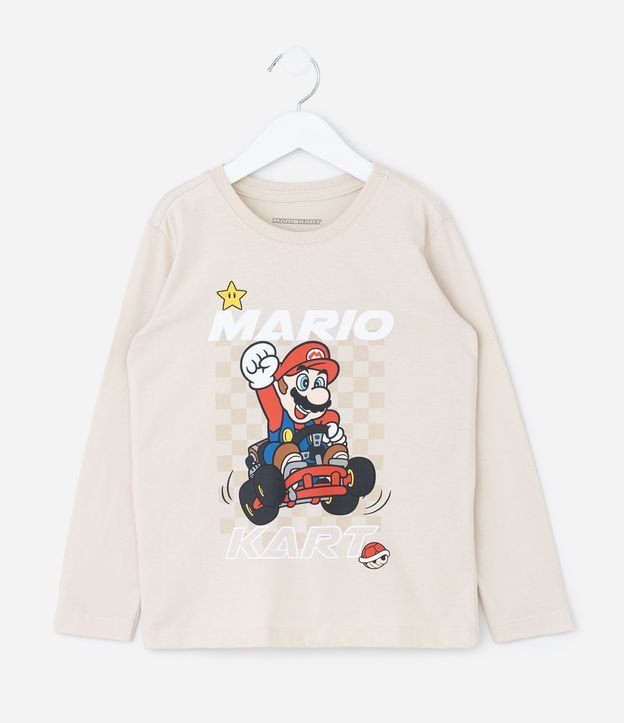 Camiseta infantil modelo regular confeccionada em algodão certificado BCI. Possui gola redonda, mangas longas e estampa localizada do universo Mario Kart com grid xadrez e ícones clássicos do jogo, criando visual divertido e moderno para compor looks casuais.