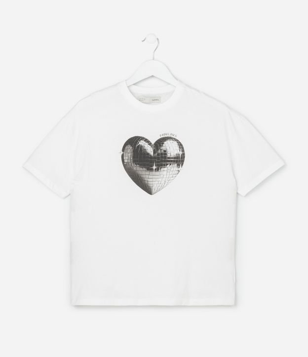Camiseta Infantil Overboxy com Estampa Globo Espelhado de Coração e Brilhos - Tam 5 a 14 Anos Branco