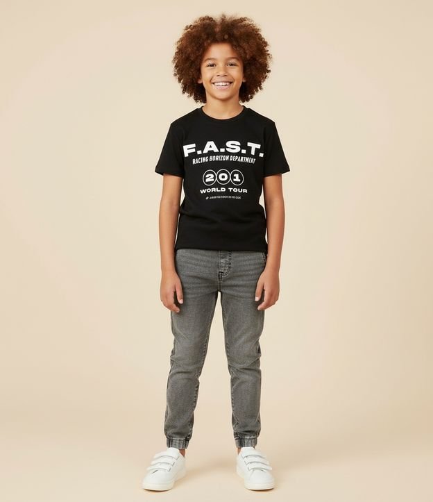 Camiseta infantil confeccionada em algodão mais sustentável através de boas práticas ambientais, no modelo regular. Possui gola redonda, manga curta, estampa lettering " F.A.S.T." e texturizada.