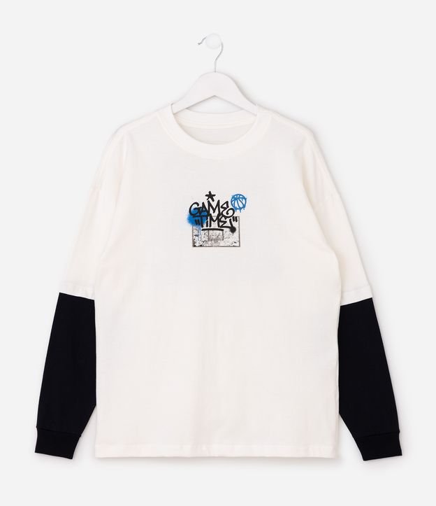 Camiseta infantil confeccionada em meia malha de algodão, com efeito sobreposto, composta por camiseta de manga curta com manga longa contrastante aplicada por baixo. Possui gola redonda, modelagem confortável e bordado localizado com temática de basquete na parte frontal, conforme imagem. Indicada para o uso diário, oferece conforto e visual casual para as atividades infantis.