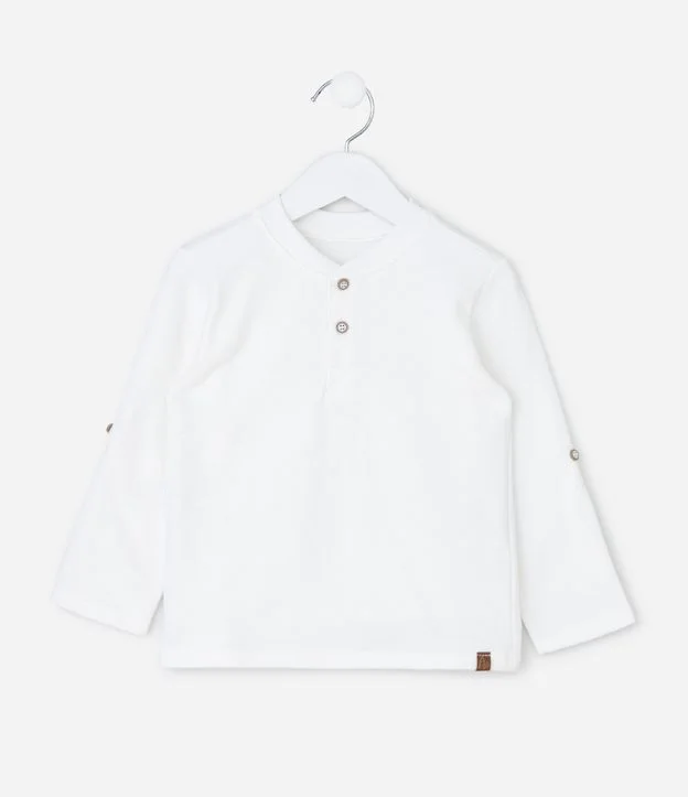 Camiseta infantil confeccionada em malha texturizada com toque macio, trazendo abertura frontal com botões e mangas longas com martingale funcional para ajuste. Possui gola redonda e acabamento confortável, ideal para composições versáteis. Confeccionada em algodão certificado BCI.