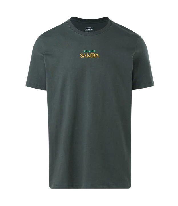 Camiseta masculina confeccionada em meia malha de algodão mais sustentável, com gola redonda, manga curta e bordado localizado Samba, ideal para o dia a dia com conforto e estilo.