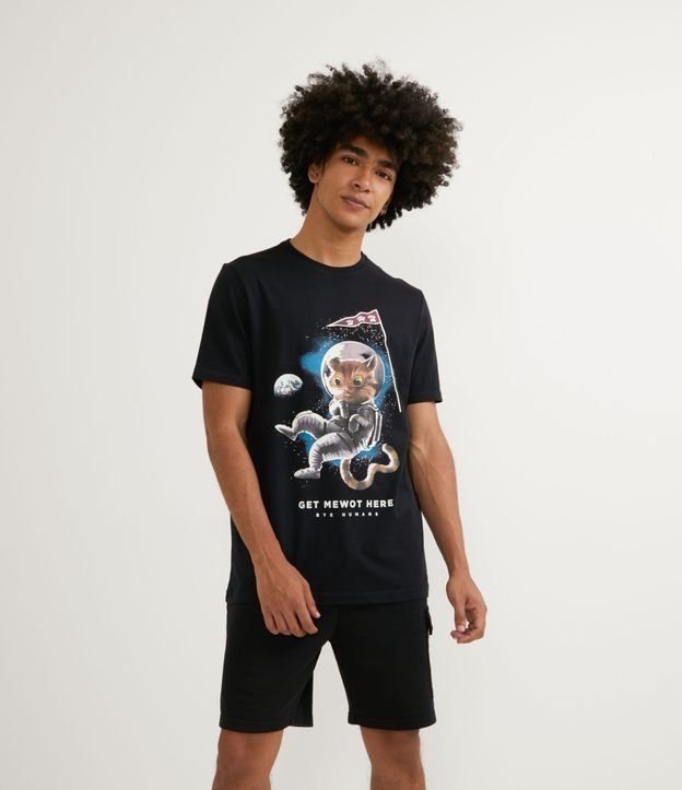 Camiseta Manga Curta com Estampa Gato Astronauta que Brilha no Escuro