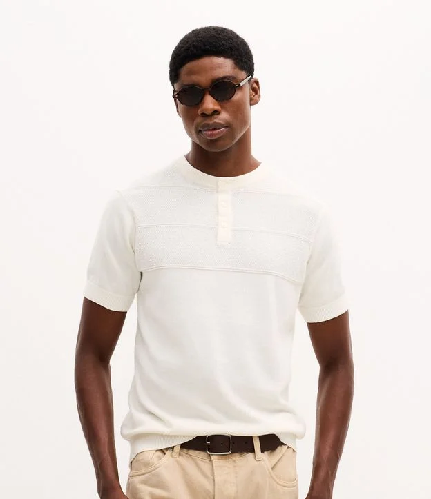 Camiseta Manga Curta Efeito Tricô Texturizado Gola Padre Branco