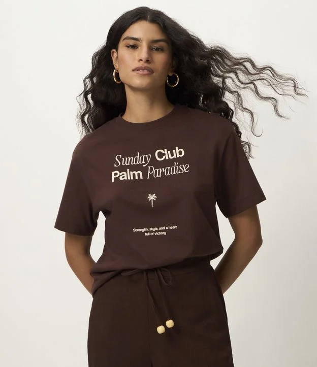 Camiseta Manga Curta em Algodão com Lettering e Palmeira Marrom