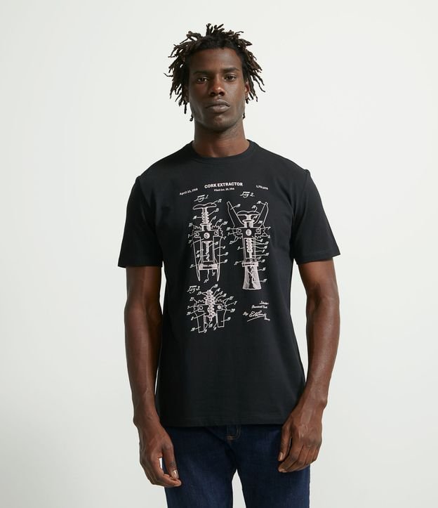 Camiseta Manga Curta em Algodão Estampa Localizada Patente Saca Rolhas