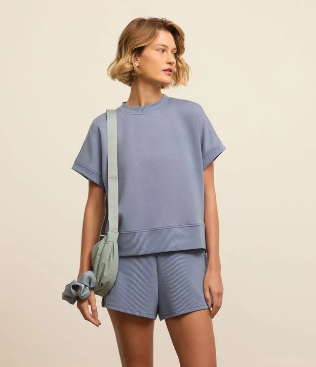 Camiseta feminina manga curta, confeccionada em microfibra, com detalhe canelado na manga e na barra.
