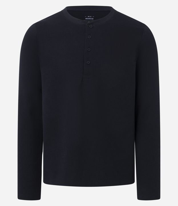 Camiseta masculina manga longa com textura waffle, detalhe de botões e modelagem muscle. Confeccionada em algodão certificado BCI e boas práticas ambientais, perfeita para um visual moderno e responsável.