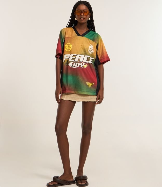 Camiseta feminina de modelo over, confeccionada em poliéster, com gola V e mangas curtas. Possui estampa lettering "Peace Joy" e fundo colorido com degradês.