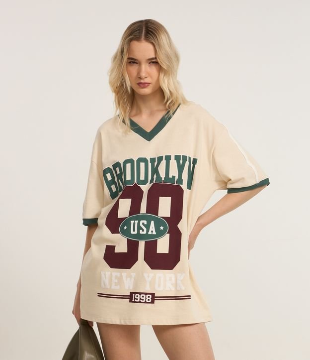 Camiseta Over em Algodão com Decote V e Estampa Lettering Brooklyn Bege