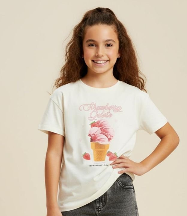 Camiseta Over Infantil com Estampa e Lettering Sorvete de Morango - Tam 7 a 16 Anos Branco