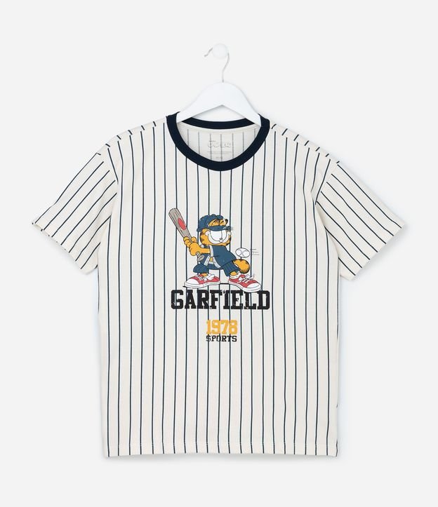 Camiseta infantil de modelo oversized, com gola redonda contrastante, mangas curtas e estampa do Garfield com taco de baseball, além de possui listras. A peça é confeccionada com boas práticas ambientais e algodão certificado bci.