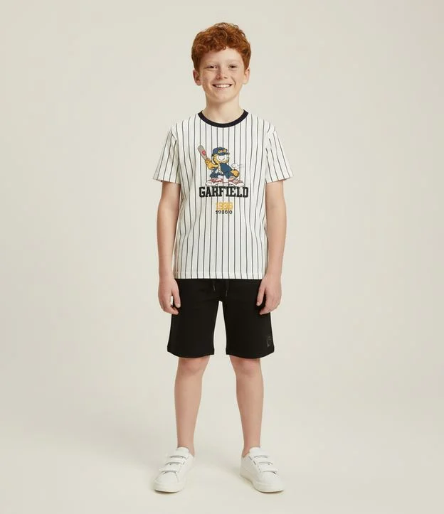 Camiseta infantil de modelo oversized, com gola redonda contrastante, mangas curtas e estampa do Garfield com taco de baseball, além de possui listras. A peça é confeccionada com boas práticas ambientais e algodão certificado bci.
