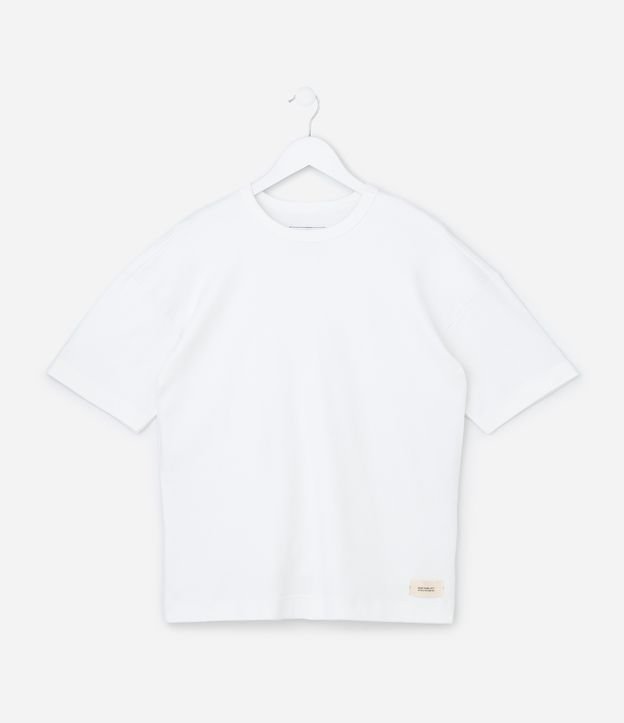 Camiseta infantil de modelo oversized, confeccionada em suedine de material e processo mais sustentáveis. Possui gola redonda, manga curta, etiqueta aplicada na barra e sem estampa.