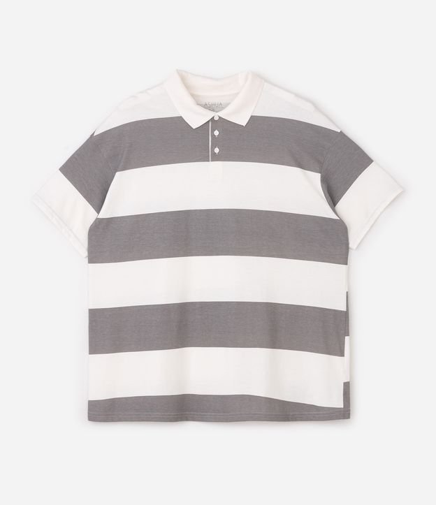 Camiseta Oversized Listrada com Gola Polo Curve & Plus Size Cinza
