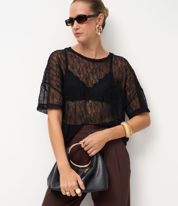 Camiseta Oversized Rendada com Transparência Preto