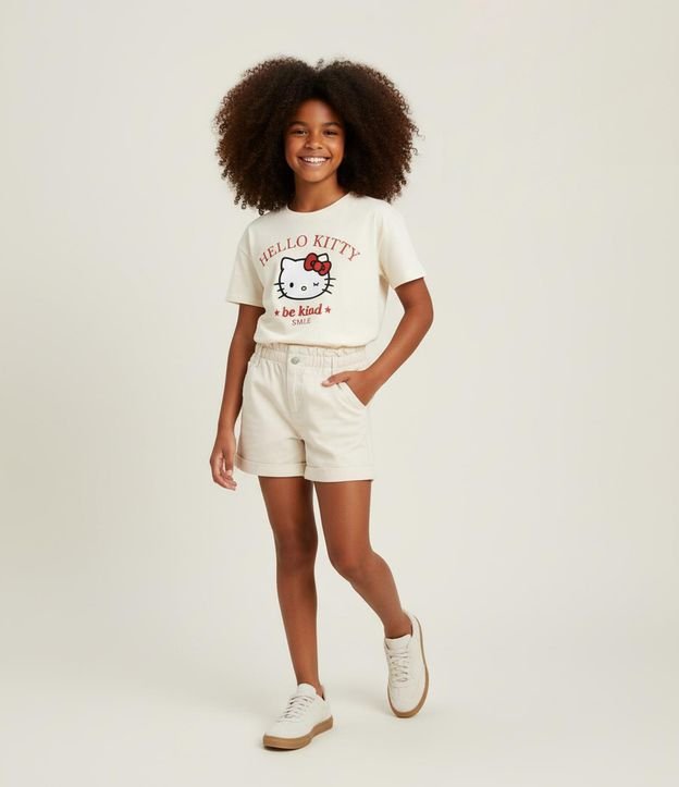 Camiseta Oversizes Infantil com Estampa e Lettering Hello Kitty Tam 5 a 14 Anos Bege
