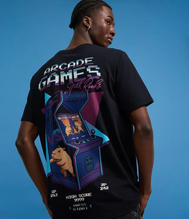 Camiseta masculina confeccionada em algodão mais sustentável através de boas práticas ambientais, no modelo regular. Possui gola redonda, manga curta, estampa de capivara e estampa lettering "Arcade Games".