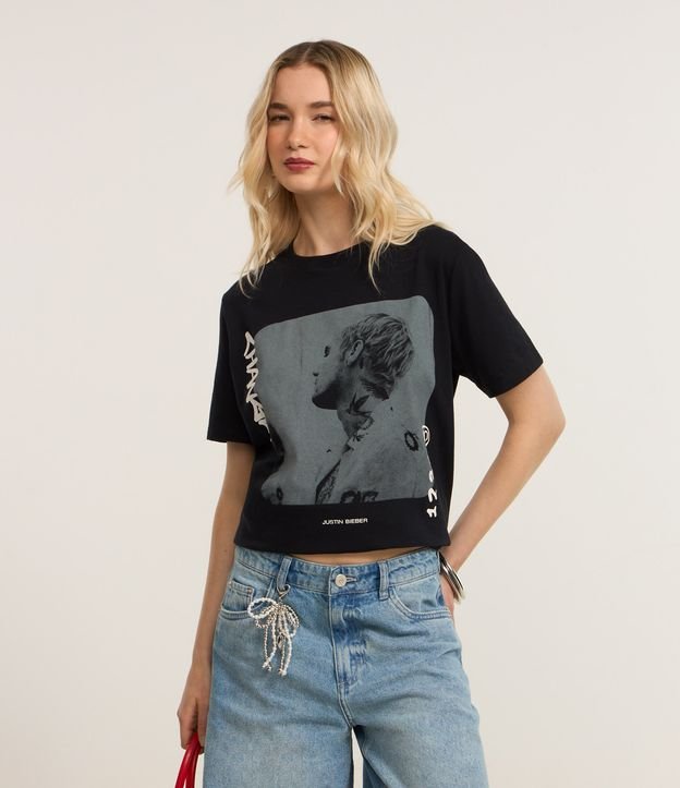 Camiseta Regular em Algodão com Estampa Justin Bieber Preto