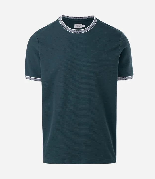 Camiseta regular em algodão texturizado BCI. Gola redonda, listras contrastantes e toque sustentável. Visual clássico com conforto, estilo e consciência ambiental.