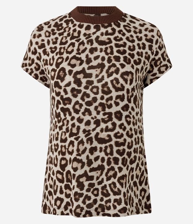 Camiseta Regular em Tricô com Gola Alta e Estampa Animal Print Bege/Marrom