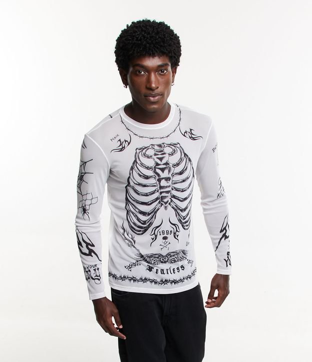 Camiseta Regular em Tule com Estampa de Esqueleto e Lettering