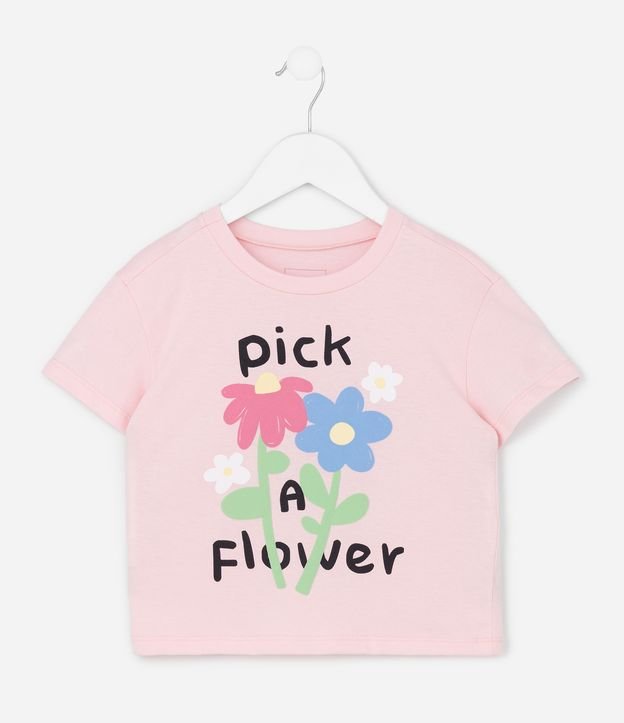 Camiseta infantil confeccionada em malha de algodão mais responsável, de modelo relaxed, com gola redonda e mangas curtas. Possui estampa frontal de flor, com lettering "pick a flower".
