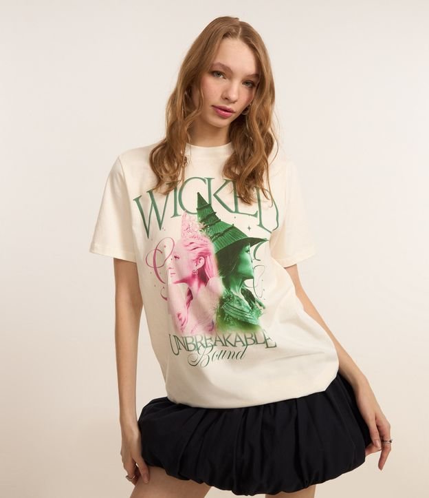 Camiseta feminina confeccionada em algodão certificado bci, peça no modelo t-shirt com gola redonda, manga curta e estampa em homenagem ao musical Wicked.
