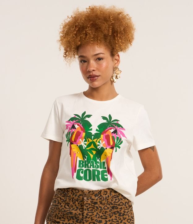 Camiseta T-shirt em Algodão com Silk em Paetês e Estampa Tropical Branco