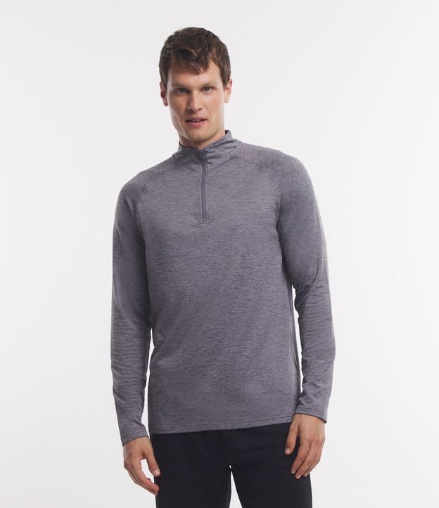 Camiseta esportiva masculina, com tecnologia térmica, gola alta com zíper, mangas longas, cavas raglan e com recortes.