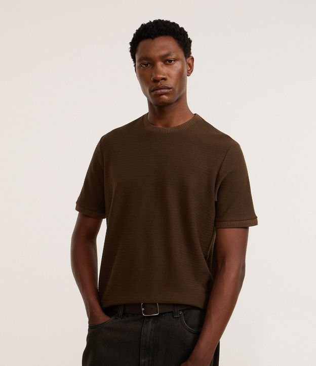 Camiseta Texturizada com Algodão e Gola Redonda Marrom
