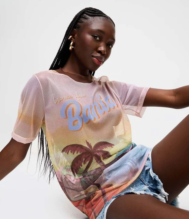 Camiseta feminina modelo tshirt, confeccionada em malha telada texturizada de poliéster. Possui gola redonda, mangas curtas e estampa de paisagem com lettering Bahia, presente na frente e costas, criando visual vibrante e moderno inspirado no litoral brasileiro.