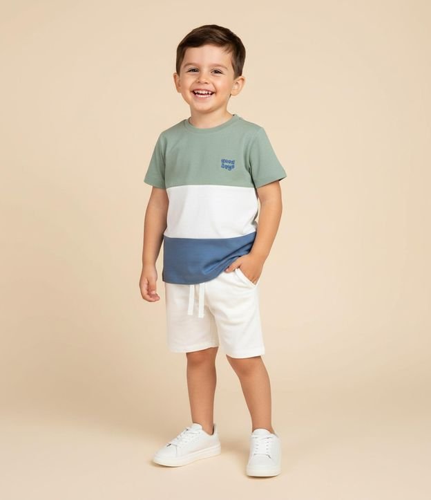 Camiseta infantil confeccionada em malha texturizada de algodão e poliéster, com gola redonda e mangas curtas. Possui padronagem frontal de blocos de cores e bordado no peito com lettering "good days".