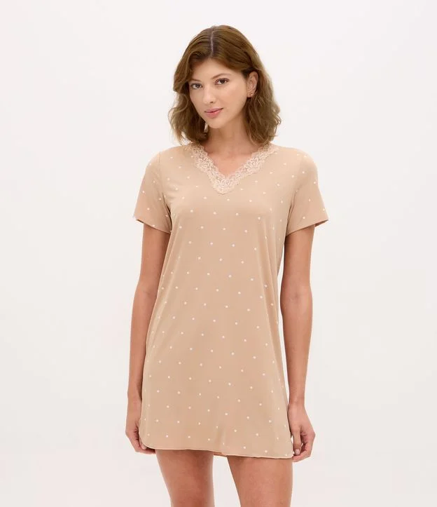 Camisola em Microfibra com Renda Floral e Estampa Poá Bege