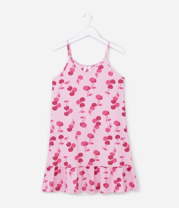 Camisola infantil confeccionada em algodão mais sustentável. Possui gola redonda, lacinho aplicado, alças finas, estampa de cerejinhas e babadinhos.