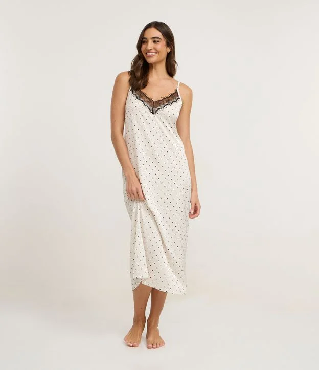 Camisola feminina confeccionada em viscose certificada, através de boas práticas ambientais. Possui modelo longo, alças finas com ajuste, detalhe de renda no decote e estampa corrida de poá.