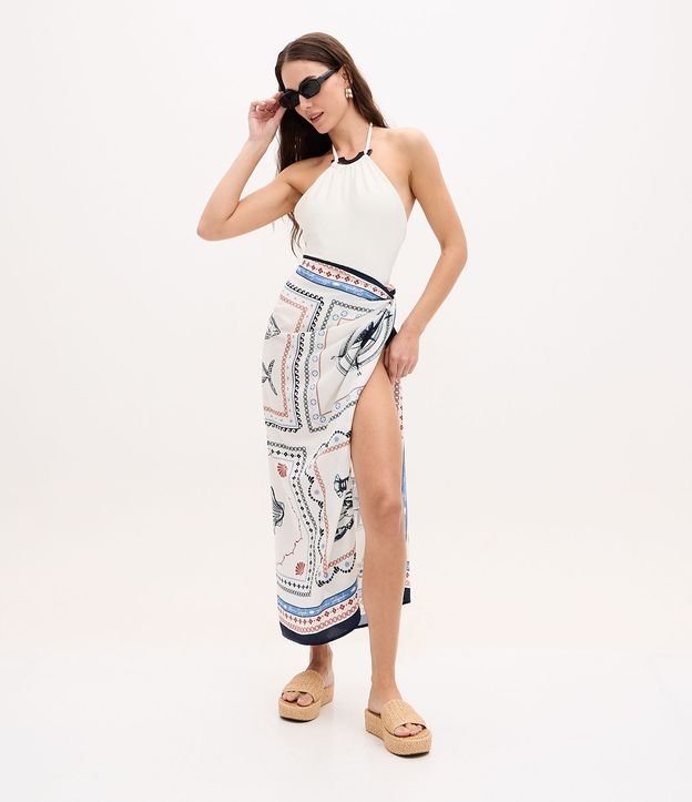 Canga feminina confeccionada viscose mais sustentável. Possui estampa de ícones náuticos distribuídos em molduras geométricas. O tecido tem caimento suave e toque macio, ideal para usar na praia, piscina ou como acessório versátil.