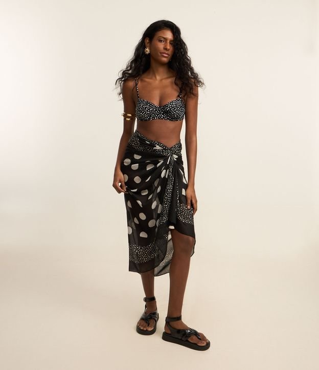 Canga de praia confeccionada em chiffon com estampa bicolor de bolinhas. O acessório é retangular e tem tasseis nas extremidades.