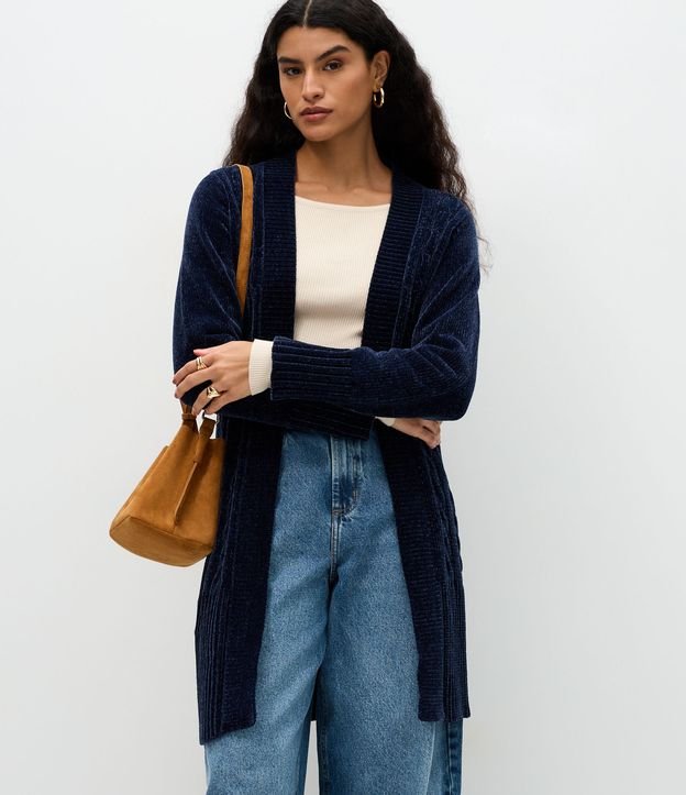 Cardigan feminino alongado em tricô com cables marcados. Possui punhos canelados, design aberto, leve e confortável, ideal para compor looks versáteis.